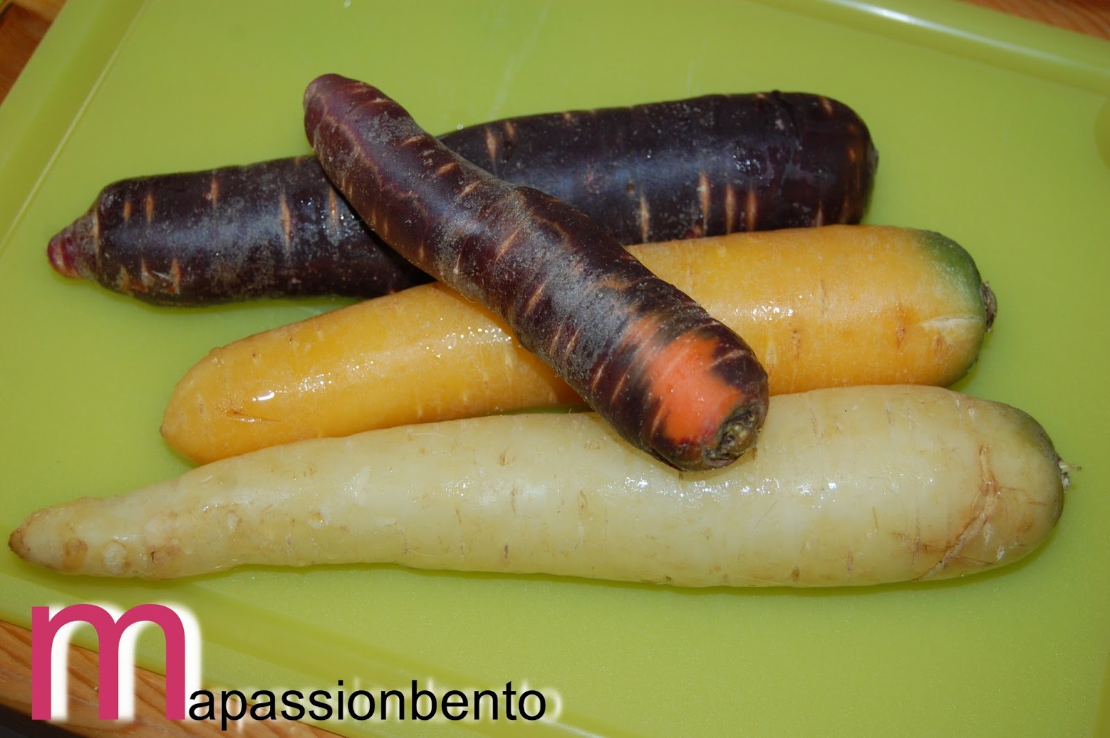 Depuis l'temps que j'voulais acheter ces carottes pour voir ce que ça donnait, c'est fait... (un ptit conseil : ne pas cuire dans la même casserole les rouges et les autres, elles déteignent !)